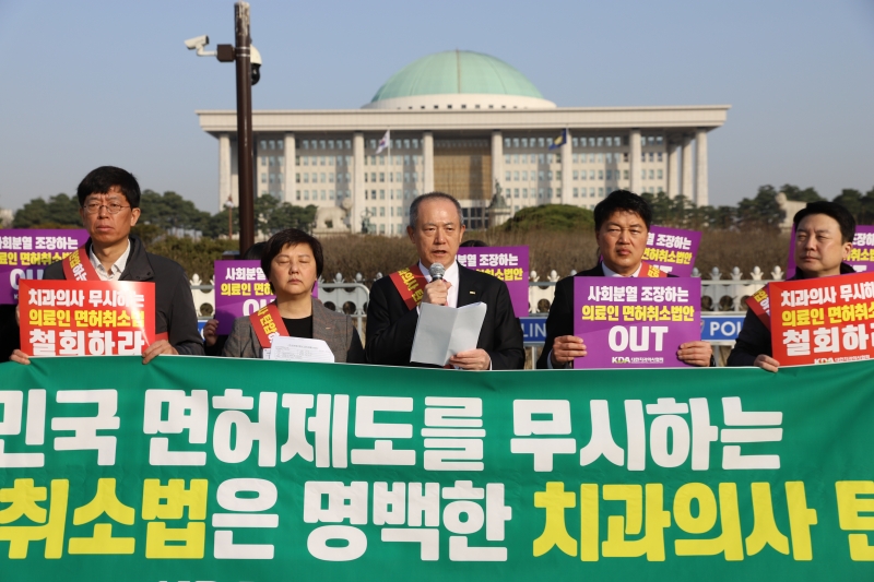 이창주 치무이사와 황혜경 문화복지이사는 "국민건강을 책임지고 있는 치과의사를 포함한 의료인을 무시하며 강행되는 의료인 면허취소법을 즉각 철회하라"고 규탄했다.