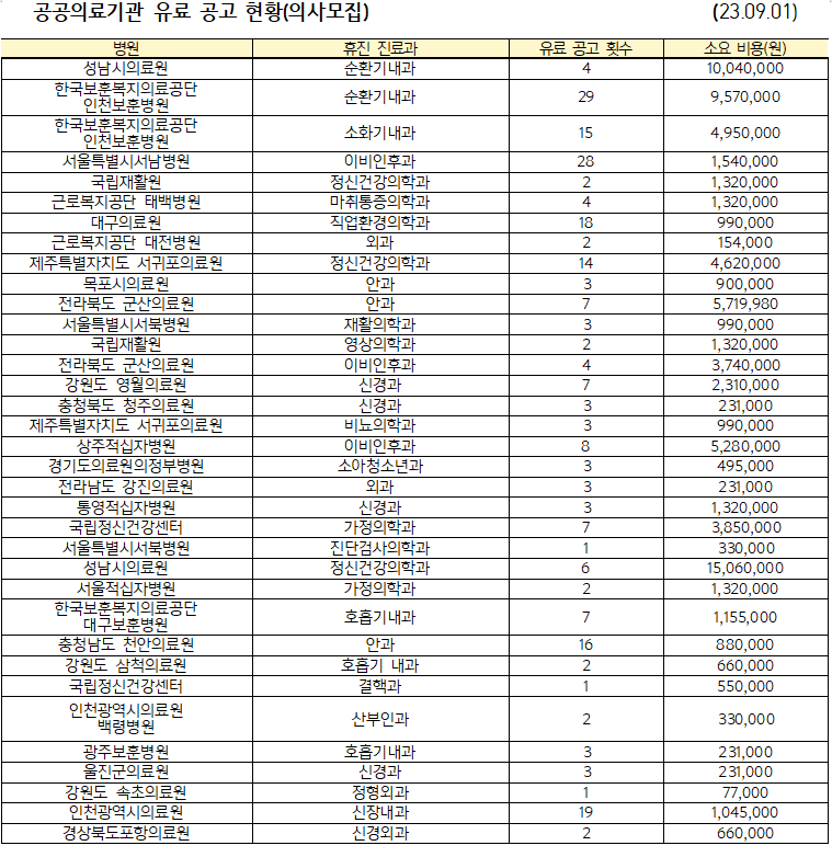 의사 공고로 1000만원 이상 지출···성남시의료원·인천보훈병원 등
