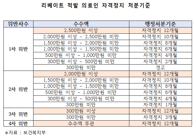 적발된 의료인은 짧게는 2개월에서 길게는 12개월까지 의사면허 자격정지 등 행정처분을 받고 1차 위반시 금품 수수액 2500만원 이상이면 자격정지 12개월, 수수액 300만원 미만이면 경고처분이 내려진다.