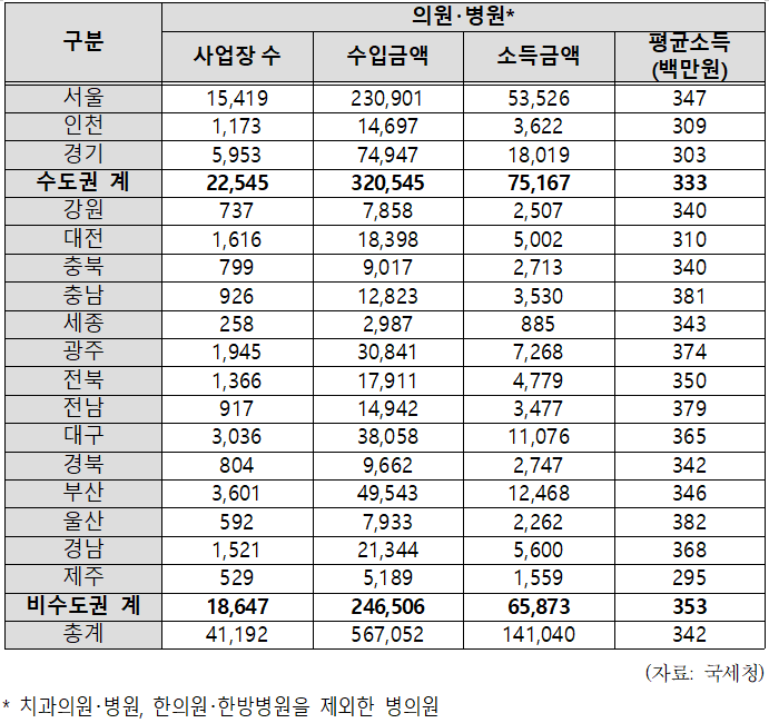 자료에 따르면 2021년 지역별 의료인 평균 사업소득은 수도권이 3억3300만원, 비수도권이 3억5300만원으로 비수도권 개원의가 수도권 개원의 보다 높은 소득을 올리는 것으로 집계됐다.