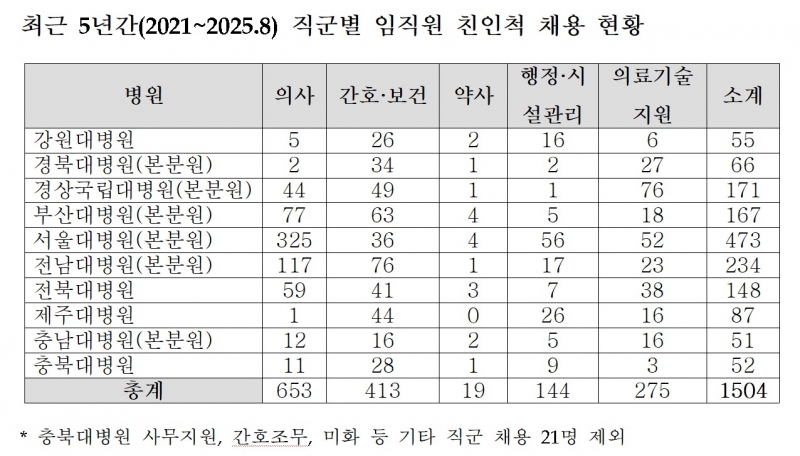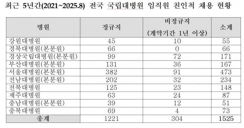 최근 5년간 전국 10개 국립대병원에서 임직원 친인척(8촌 이내 혈족, 4촌 이내 인척, 배우자) 1525명이 채용된 것으로 확인됐다.