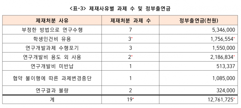 제재처분별 사유를 보면 부정한 방법으로 연구를 수행한 과제가 7개로 가장 많았고, ‘학생 인건비 유용’과 ‘연구개발과제 수행포기’ 과제가 3개로 뒤를 이었다.