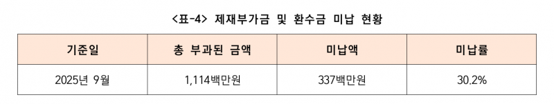 진흥원은 제재처분 미이행 기관에 대한 재산조사까지 실시하며 제재부가금과 환수금 징수를 위해 노력하고 있지만 여전히 요원한 상황이다.