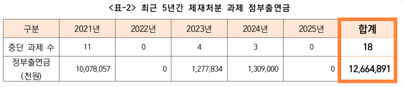 국회 보건복지위원회 이주영 의원(개혁신당)에 따르면 한국보건산업진흥원이 지원한 R&D 과제 중 최근 5년간 중단된 연구과제 77개에 지급된 정부출연금은 1300억원, 제재처분을 받은 18개 정부출연금은 126억원이었다.