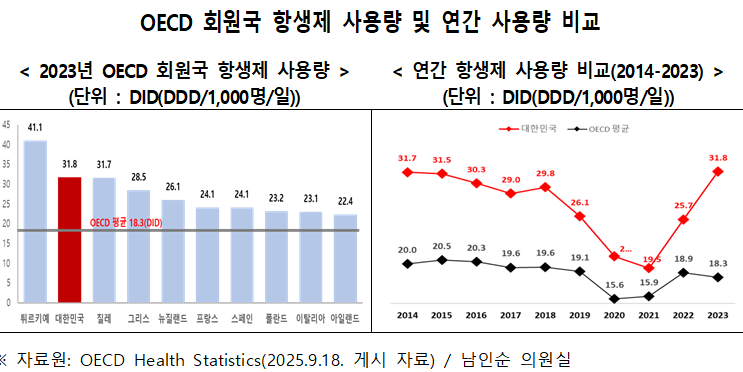 지난 2023년 우리나라 항생제 사용량은 31.8 DID(Defined Daily Dose)로, OECD 34개국 중 튀르키예 다음으로 2위로 나타났다.