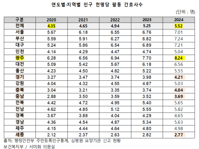 이는 2020년 전국 평균(4.35명)에도 미치지 못하는 수준이다. 2024년을 기준으로 간호사가 가장 많은 광주광역시와 세종특별자치시를 비교하면 두 지역 간 격차는 약 3배에 달했다.
