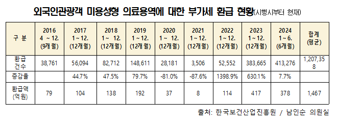 또 현행 조세특례법은 ‘외국인관광객 미용성형 의료용역에 대한 부가가치세 환급 특례’를 두고 있는데, 남 의원은 이에 대한 전면 재검토가 필요하다고 봤다.