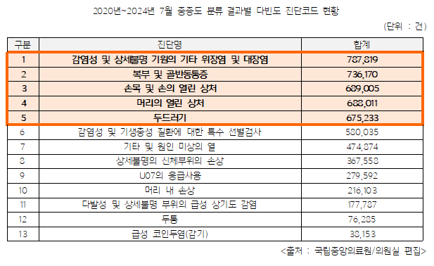 복부 및 골반동통증 73만6170건, 손목 및 손의 열린 상처 68만9005건, 머리 열린 상처 68만8011건, 두드러기 67만5233건 순이었다.