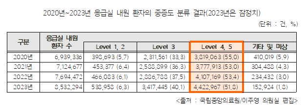 응급실 내원 환자 중 준응급이거나 비응급인 4등급, 5등급 환자 비중이 2020년 이후 2023년까지 53.3%에 달한 것으로 나타났다.