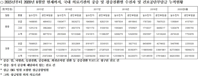 또 같은 기간 경증환자의 상급종합병원 이용에 따른 건보공단 부담금은 19조4000만원으로 집계됐다. 연도별로는 2015년 2조6651억원, 2016년 3조320억원, 2017년 3조3361억원, 2018년 3조8271억원, 2019년 4조2746억원, 올해 2조2550억원(8월말까지) 등으로 나타났다.