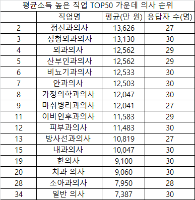 이밖에 안과의사·가정의학과의사·마취병리과의사·이비인후과의사·방사선과의사·내과의사·소아과의사·일반의사 등이 50개 직업 안에 포함됐다. 전문의 가운데서는 소아과의사 평균 소득이 7950만원으로 가장 낮았다.
