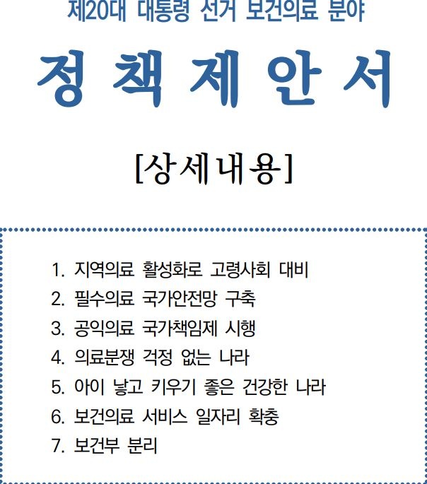 정책제안서에는 ▲지역의료 활성화로 고령사회 대비 ▲필수의료 국가안전망 구축 ▲공익의료 국가책임제 시행 ▲의료분쟁 걱정 없는 나라 ▲아이 낳고 키우기 좋은 건강한 나라 ▲보건의료 서비스 일자리 확충 ▲보건부 분리 등 7대 정책이 담겼다.
