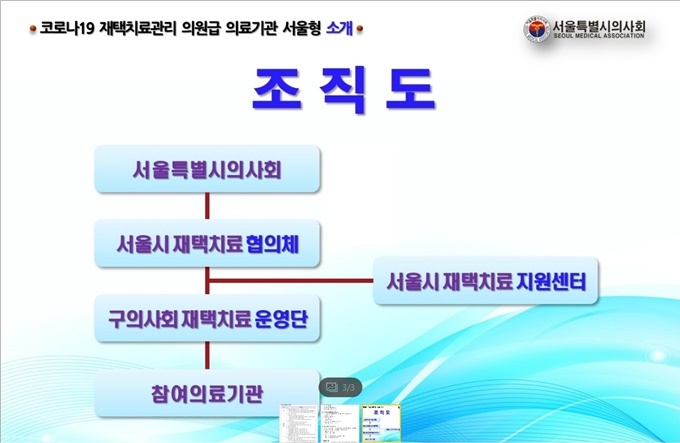 우선 서울형 모델은 서울시의사회 산하에 재택치료협의체, 구의사회 재택치료 운영단, 참여 의료기관, 그리고 이를 뒷받침할 서울시재택치료지원센터 등으로 구성된다.