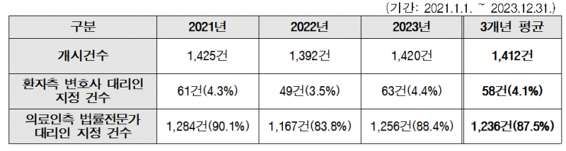 하지만 이 중 환자 측 변호사 대리인을 지정한 비율은 2021년에 4.3%(61건), 2022년에 3.5%(49건), 2023년에 4.4%(63건)로 3개년 평균 4.1%(58건)에 불과했다.