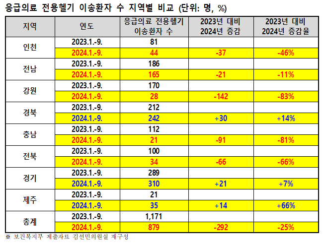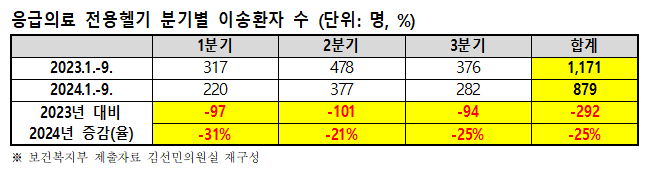 올해 1월부터 9월까지 응급의료 전용헬기로 이송한 환자는 879명으로 이는 작년 같은 기간 1171명에 비해 292명(-25%) 감소했다.