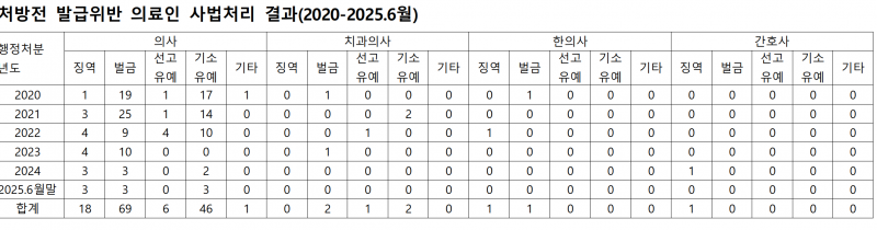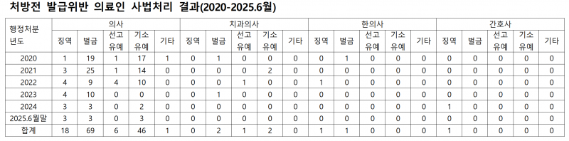 국회 보건복지위원회 서미화 국회의원(더불어민주당)이 보건복지부로부터 제출받은 자료에 따르면 최근 5년간 처방전 발급위반(이하 대리처방)으로 인한 사법처리를 받은 의료인 148명 중 20명은 징역형을 받아 면허가 정지됐다.