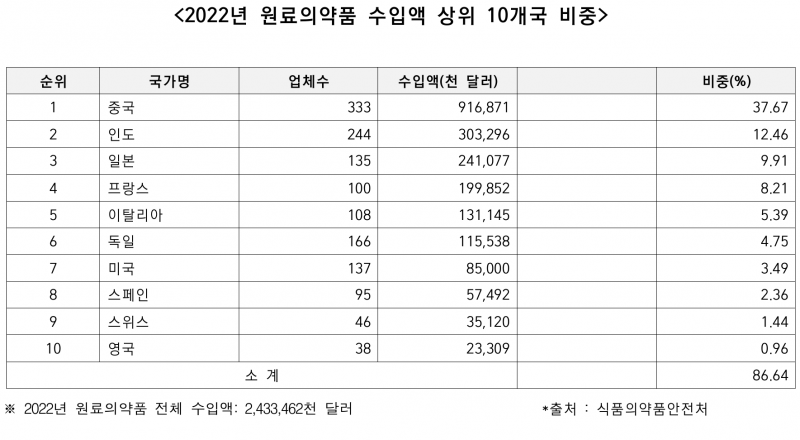 같은 기간 원료의약품 수입은 중국(37.7%), 인도(12.5%)에서 집중적으로 들어와 특정국가 의존도가 높은 구조가 확인됐다.