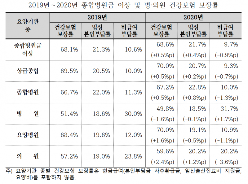 다른 종별로 보면 종합병원은 67.2%, 병원 49.8%, 의원 59.6% 등으로 병원과 의원은 전체 보장률보다 낮은 수치를 기록했다. 병원의 경우는 전년 대비(51.4%)보장률이 오히려 감소했다.