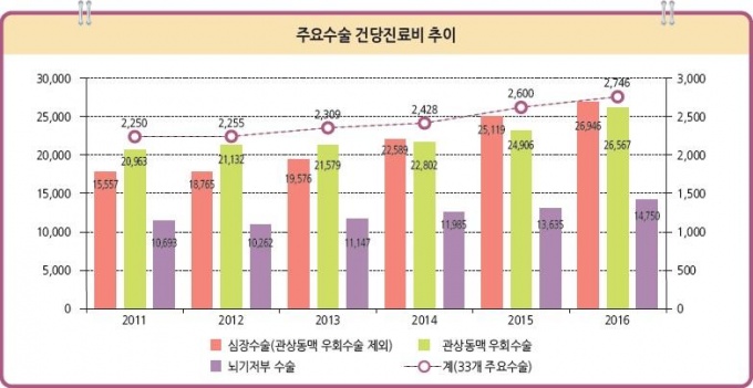 이에 따르면 주요수술 진료비(비급여 제외) 총액은 2011년 3조7278억원에서 2016년 4조9251억원으로 연평균 5.7% 증가했다.