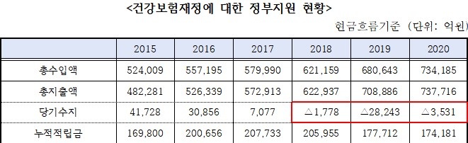 특히 문재인 정부 들어 급격한 보험료 인상으로 가입자 보험료 부담이 늘고 있지만 정부 지원 비율은 거꾸로 낮아지고 있어 개선이 필요하다는 지적이다.