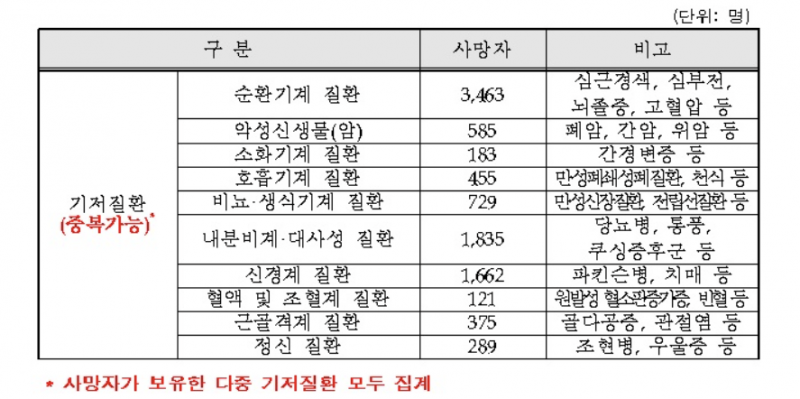 즉, 전체 사망자(5015명)의 95.7%인 4800명은 암질환(폐암, 간암, 위암 등), 뇌졸중, 심근경색, 심부전, 간경변증 등 기존의 기저질환을 앓고 있었던 사람이다.