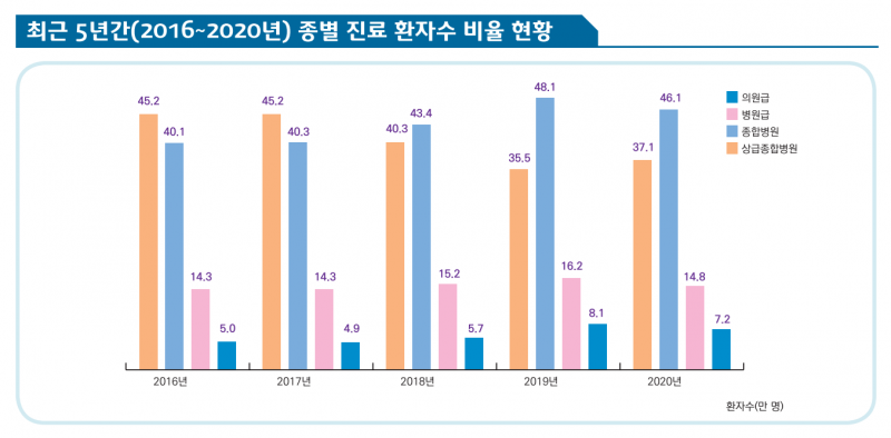 MRI 또한 종합병원 비율이 46%로 가장 많은 비중을 차지했다. 병원 비율은 2017년까지만 해도 상급종합병원 비율이 높았지만 그 뒤로 종합병원 환자수가 더 많아졌다.