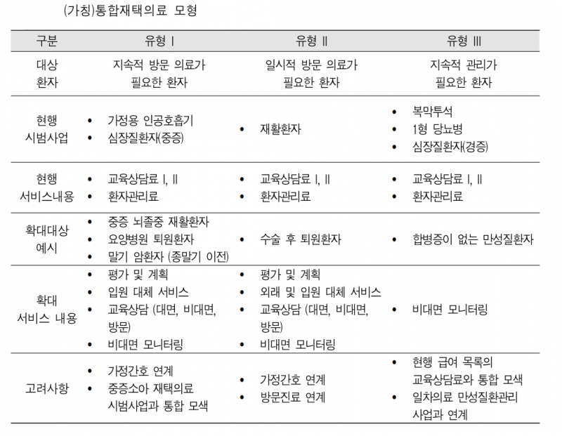 중장기적으로는 재택의료를 통해 환자 증상을 지속적으로 모니터링하고 필요시 방문의료를 시행할 수 있도록 하는 통합모형을 고려할 필요가 있다.