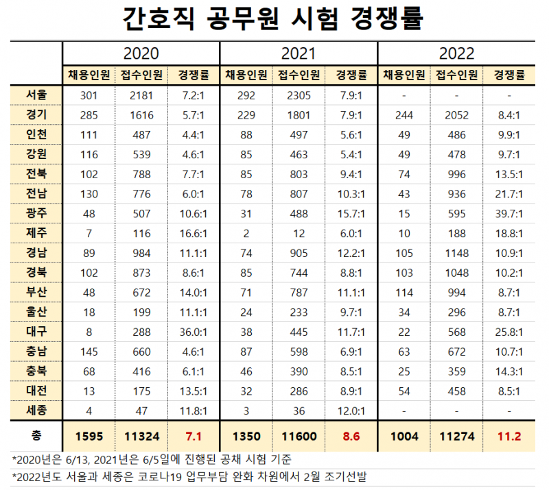2022 간호직 공무원 공개채용에서 가장 경쟁률이 낮은 지역은 경기(8.4대 1), 대전(8.5대 1), 부산·울산(8.7대 1) 순이었다.
