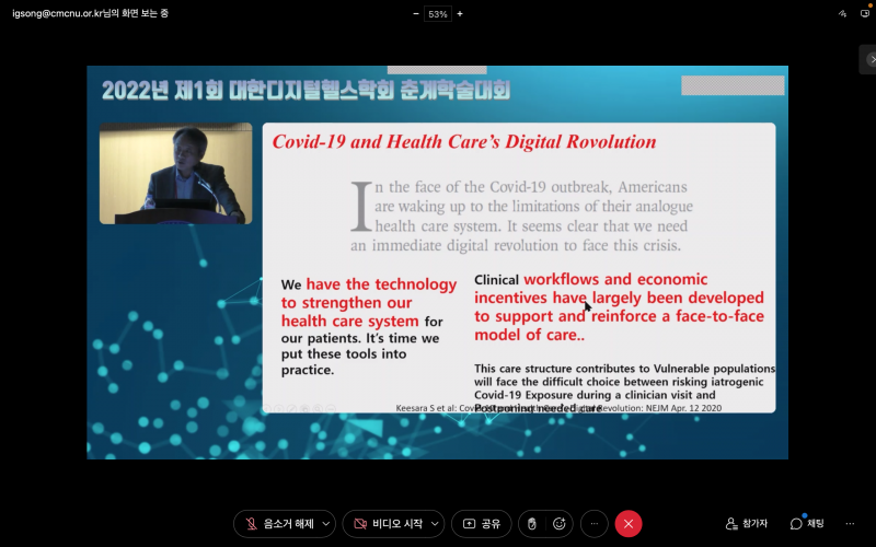 이날 오전 8시 50분부터 오후 5시까지 열린 학술대회는 은평성모병원과 화상회의 플랫폼 웹엑스에서 동시에 진행됐으며, 비대면 진료를 비롯해 디지털 헬스케어 임상 적용과 컨버전스까지 최신 트렌드를 반영한 다양한 강연이 이어졌다.