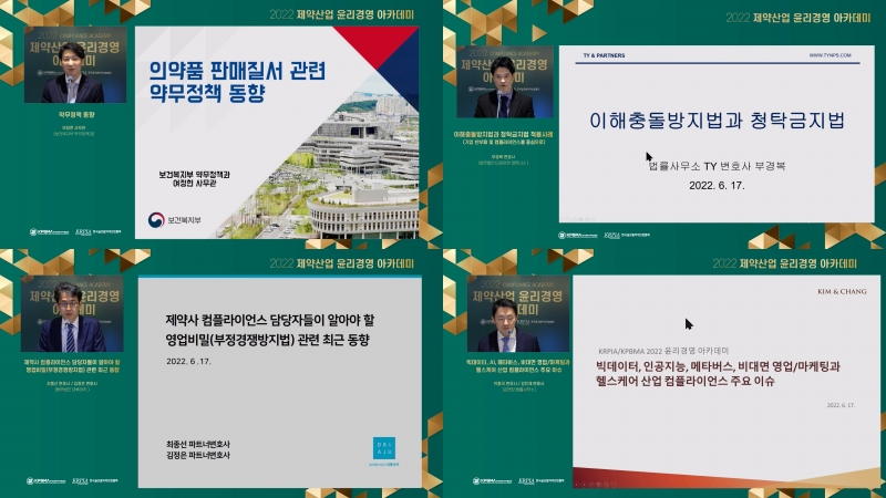 행사는 ▲의약품 판매질서 관련 약무정책 동향(여정현 보건복지부 약무정책과 사무관) ▲이해충돌방지법과 청탁금지법(부경복 TY법률사무소 변호사) ▲제약사 컴플라이언스 담당자들이 알아야 할 부정경쟁방지법 관련 최근 동향(최종선·김정은 대륙아주 변호사) ▲빅데이터·인공지능·메타버스·비대면 영업/마케팅과 헬스케어 산업 컴플라이언스 주요 이슈(박종국·강인제 김앤장 법률사무소 변호사) 등의 주제발표로 구성됐다.