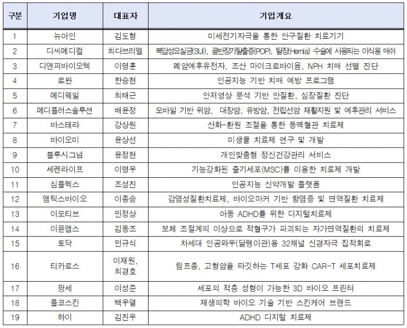 업체는 뉴아인, 디씨메디컬, 디앤피바이오텍, 로완, 메디웨일, 메디플러스솔루션, 바스테라, 바이오미, 블루시그넘, 세렌라이프, 심플렉스, 엠틱스바이오, 이모티브, 이뮨앱스, 토닥, 티카로스, 팡세, 플코스킨, 하이 등이다.