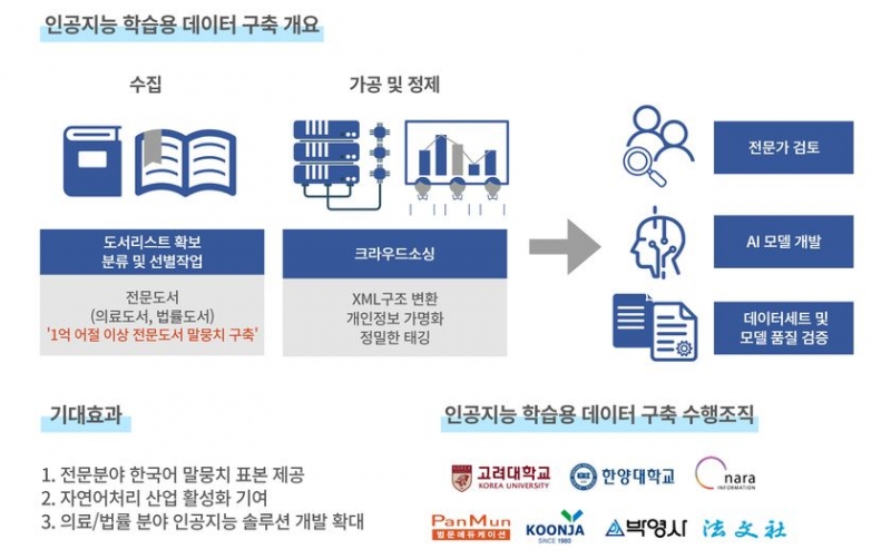 이번 구축사업에서 고려대 산학협력단은 ‘의료, 법률 전문 서적 말뭉치 데이터 구축’ 분야를 맡아 의료 및 법률 분야 말뭉치를 체계적으로 분류하고 데이터를 구축할 예정이다.