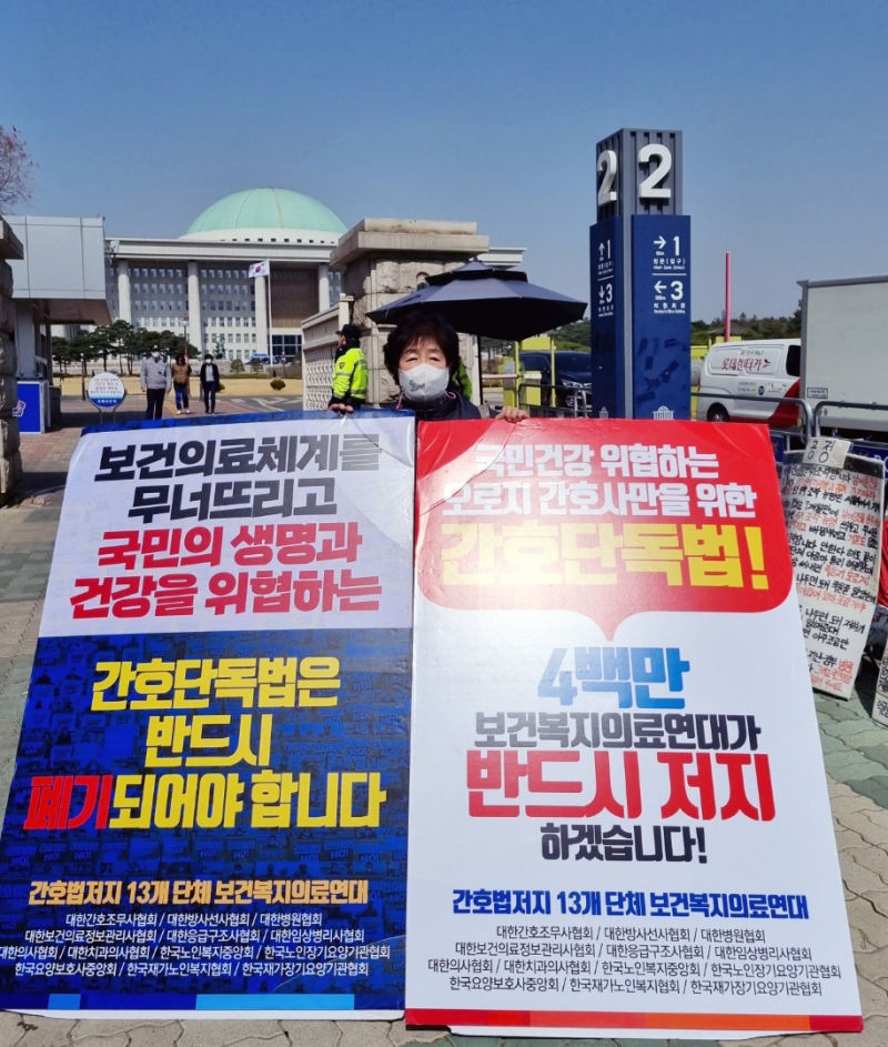 3월 21일 국회 앞에서 ‘간호법 제정 반대’ 릴레이 1인 시위에 동참하고 있는 대한간호조무사협회 부산시회 주춘희 회장의 외침이다.
