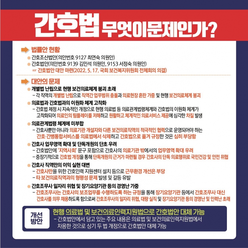 이어 “그러나 복지위에서 의결된 간호법 대안은 반대단체 주장 사실 여부를 떠나 직역 간 갈등을 해소하고자, 간호법 업무를 현행 의료법 그대로 ‘의사 등 지도 하에 시행하는 진료보조’로 규정했으며 ‘다른 법률 우선 적용’조문도 삭제됐다”고 반박했다.