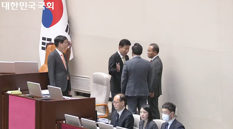 본회의 시작 후 약 2시간 30분이 경과한 시점 간호법 의사일정 변경동의안 표결을 위해 윤재옥 국민의힘 원내대표와 박홍근 민주당 원내대표가 김진표 국회의장과 합의에 나섰다.