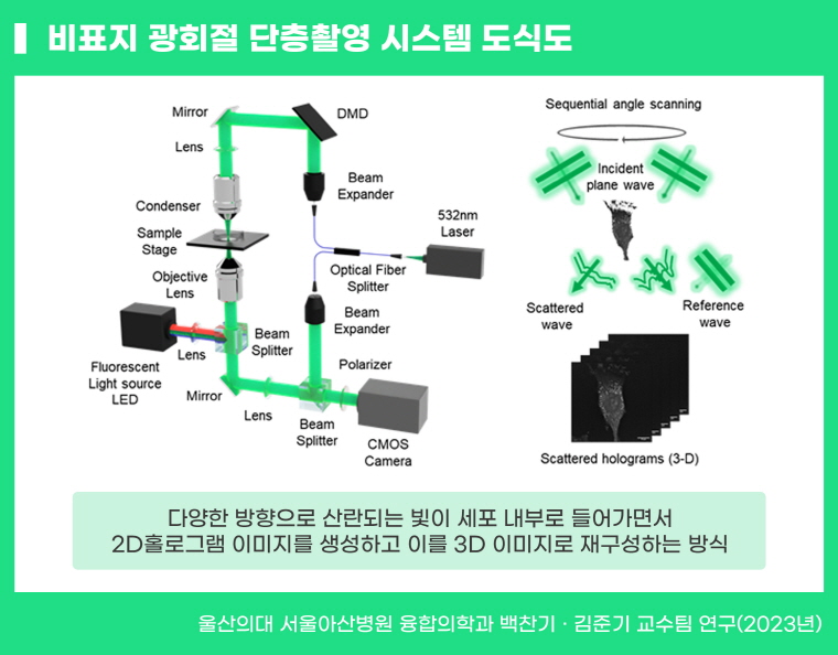 ODT 기술은 세포 내부로 빛을 조사해 산란된 빛을 수집하고, 표준 광원을 이용한 홀로그램 방식으로 3차원 영상을 재현한다. 이를 통해 세포 전처리 과정없이 비침습적인 방식으로 투명한 세포를 실시간 관찰하고 세포 소기관의 굴절률과 부피 등 다양한 물리적 정보를 획득할 수 있다.
