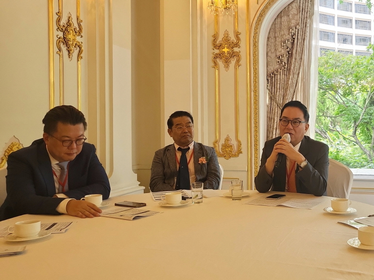 3일 서울 소공동 롯데호텔서 열린 대한위대장내시경학회 추계학술대회 기자간담회에서 박근태 이사장(맨 오른쪽)이 발언하고 있다. 왼쪽은 조원영 총무이사와 장웅기 회장. 서동준 기자