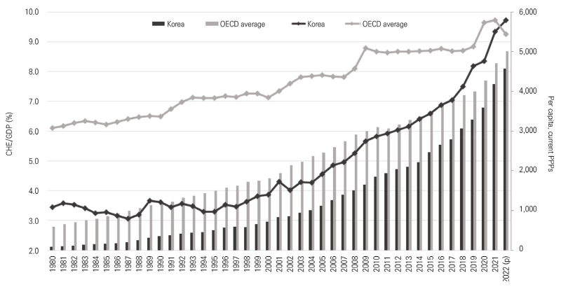 이와 정반대로 한국의 국민의료비 비중은 2021년 9.3%에서 2022년 9.7%로 증가했다. 이에 따라 한국의 국민의료비 비중이 처음으로 OECD 평균을 넘어섰다.