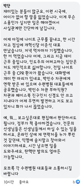 한편, 이 같은 설전 속에도 박단 회장을 비롯해 사직서를 내고 있는 전공의들을 응원하고 위로하는 선배 의사들도 있었다.