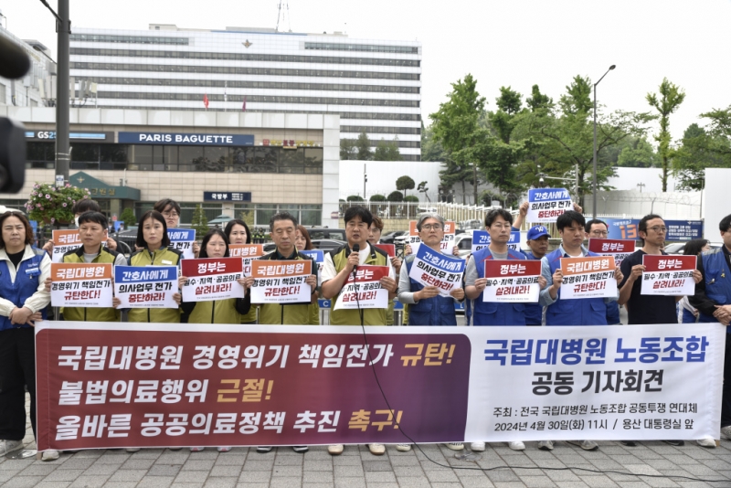 보건의료노조 경상국립대학병원지부를 비롯한 13개 국립대학병원 노동조합으로 구성된 ‘국립대병원노동조합 공동투쟁 연대체’는 30일 오전 용산대통령실 앞에서 기자회견을 열고 이같이 주장했다.