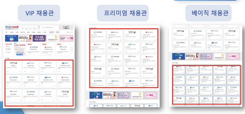 비용이나 노출 위치 및 방식에 따라 ▲베이직 채용관 ▲프리미엄 채용관 ▲VIP 채용관으로 나눠지는데, 의료기관 채용 계획 및 예산에 따라 선택하면 된다. 비용도 저렴하게 진행될 예정이다.