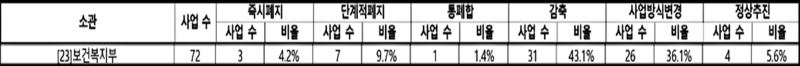 전체 평가대상 중 22개 부처, 204개 사업이 감축 판정을 받았으며 사업 개수 기준으로 문화체육관광부 31개, 복지부 31개, 환경부 29개 순으로 사업 개수가 많았다.