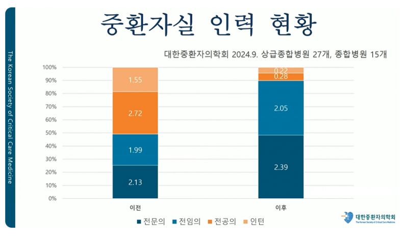 그는 "고난이도이며 노동 강도가 높은 중환자 진료는 상대적으로 전공의 의존도가 높다"며 "전문의 중심 진료체계로의 전환이 시급한 분야로, 근무환경 개선 및 전문인력 양성 지원이 필요하다"고 피력했다.