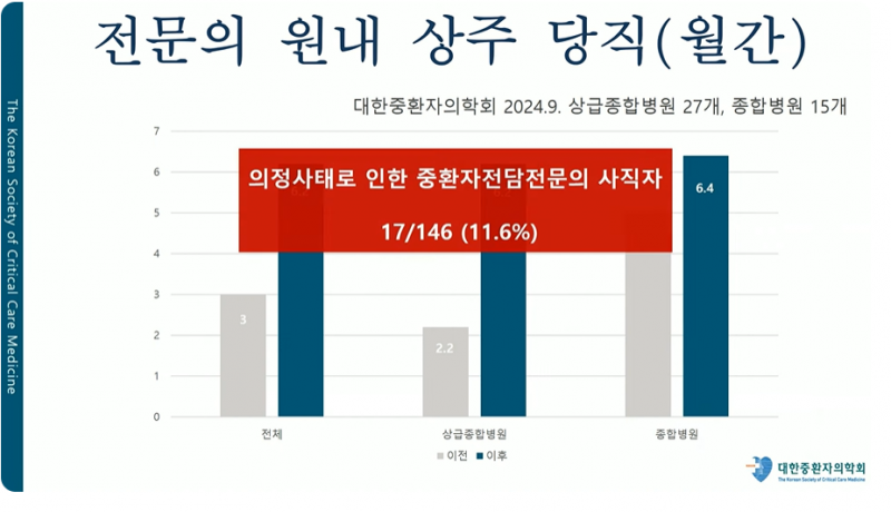 이처럼 업무가 가중되면서 중환자실을 떠난 전담전문의는 146명 중 17명(11.6%)다. 사직자들은 처우가 더 좋은 근처 병원 또는 대형병원 중환자실로 흡수되고 있다는 설명이다.
