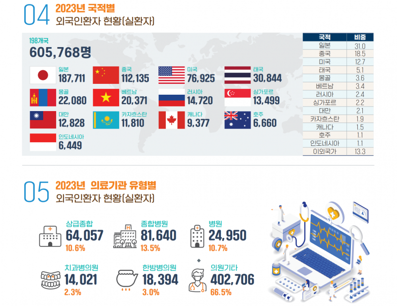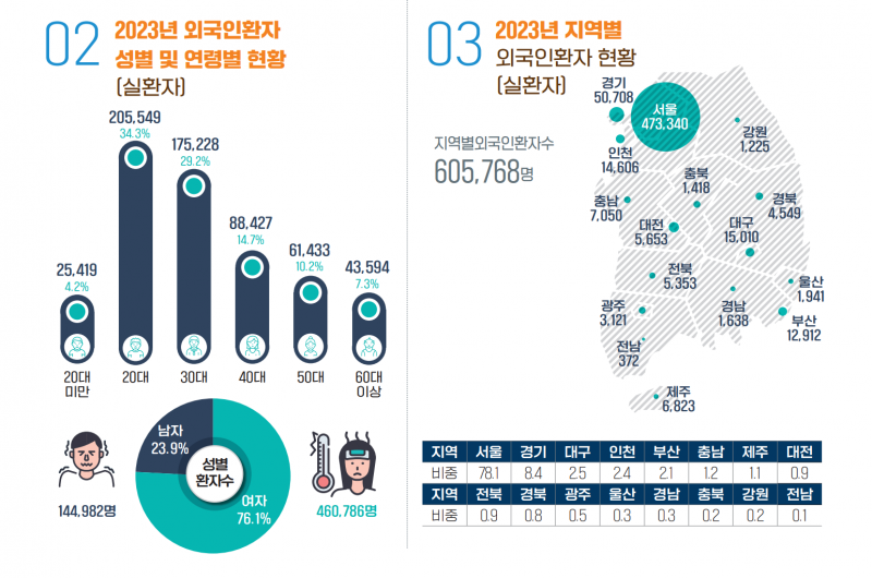 한국보건산업진흥원이 최근 발간한 '2023 외국인 환자 유치실적 통계분석 보고서'에 따르면 2023년 한국의료를 이용한 외국인 환자는 60만5768명을 기록했다.
