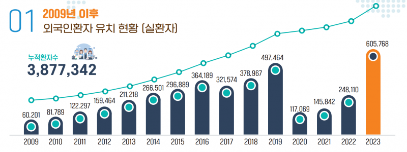 외국인 환자 규모는 2009년부터 2019년까지 연평균 23.5% 규모로 꾸준히 성장하다가 2020년 코로나19 당시 12만명으로 급감했다.