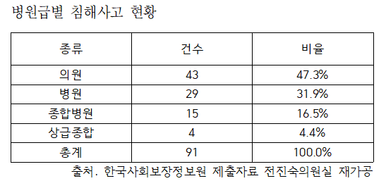 병원 규모별로 살펴보면 상급종합병원급 4건, 종합병원급 15건, 병원급 29건, 의원급 43건의 진료정보 침해사고가 일어났다.
