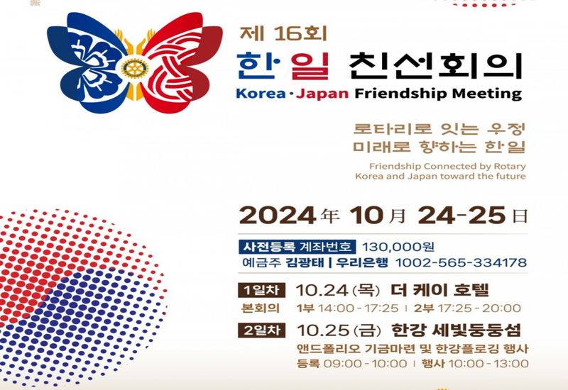 한국로타리 한일친선회(위원장 김광태·대림성모병원 회장)는 오는 10월 24~25일 더 케이호텔에서 ‘로타리로 잇는 우정, 미래로 향하는 한일’이라는 주제로 제16차 한일친선회의를 개최한다.