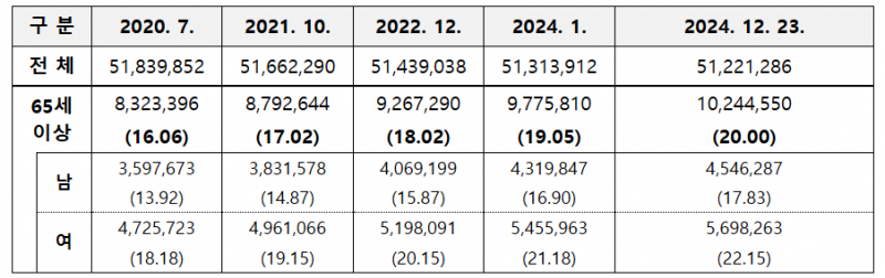 통계에 따르면 65세 이상 인구는 1024만4550명으로 전체 주민등록 인구 5122만1286명의 20%를 차지했다.