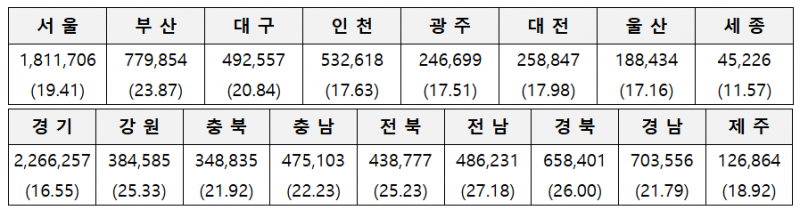수도권은 전체 주민 등록 인구 2604만6460명 중 17.7%, 비수도권은 전체 주민등록 인구 2517만4826명 중 22.38%를 차지했다.